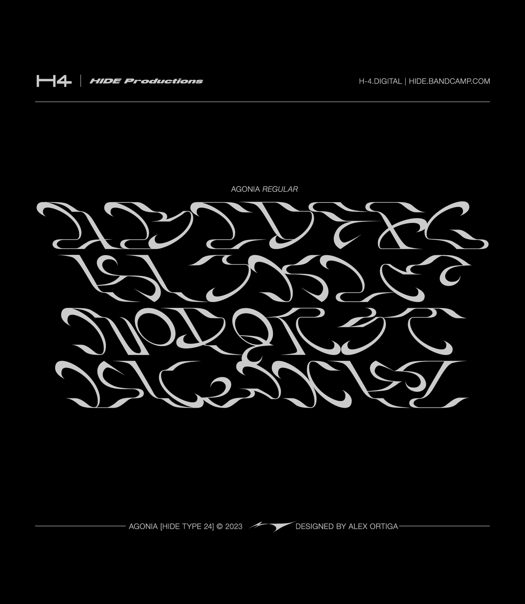 “Agonia” is an experimental font, based on some recurring handmade shapes. The outcome is both elegant and aggressive font, especially suitable for impactful and illegible titles and iconic headers. “Agonia” features 26 lowercase glyphs, 26 uppercase glyphs, 10 decorative symbols and an essential punctuation.
