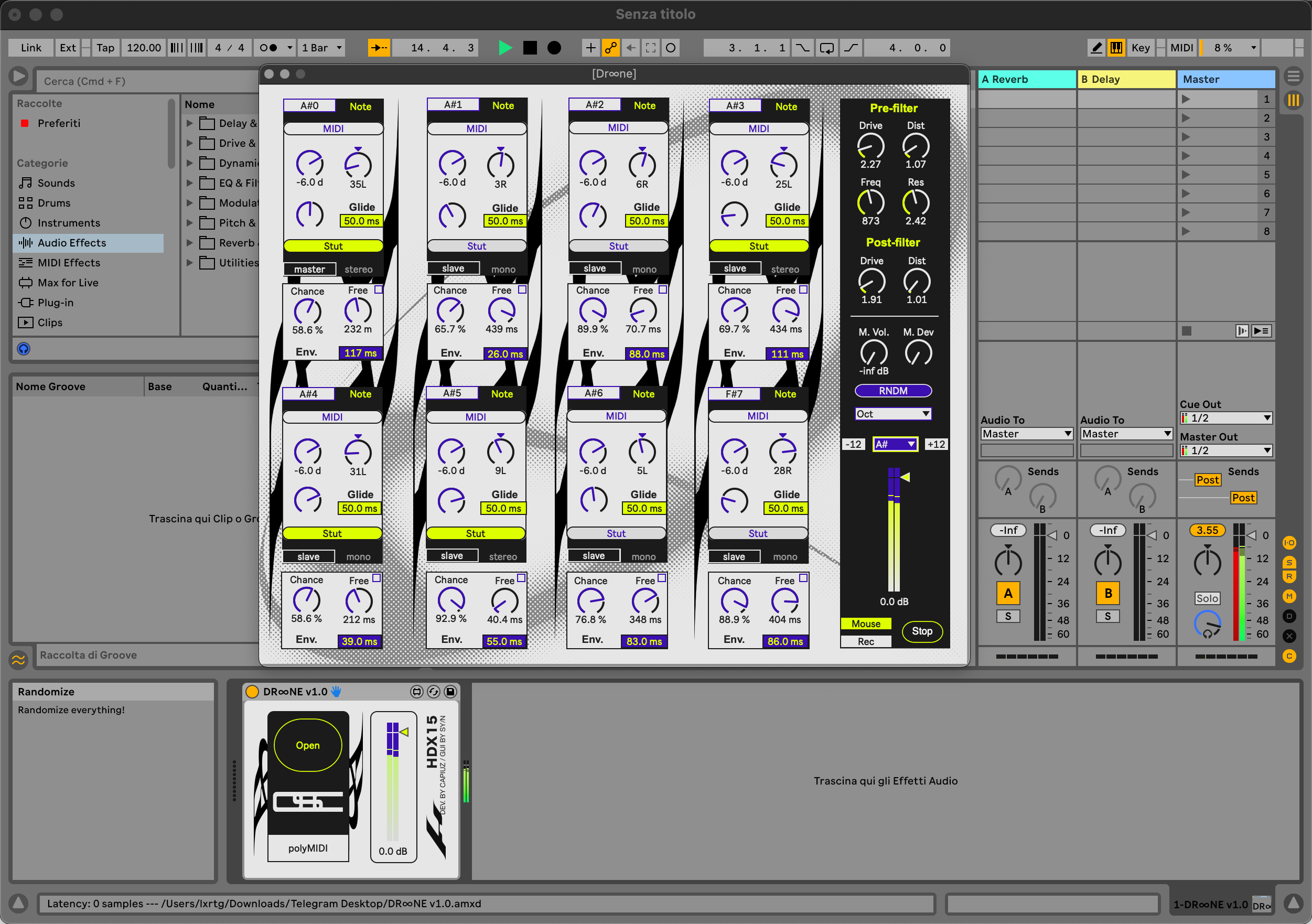 Dr∞ne is a max for live synthesizer with 8 independent voices, two-stage distortion and automation looping, capable of producing lush, rich chords to heavy distorted walls of sound.