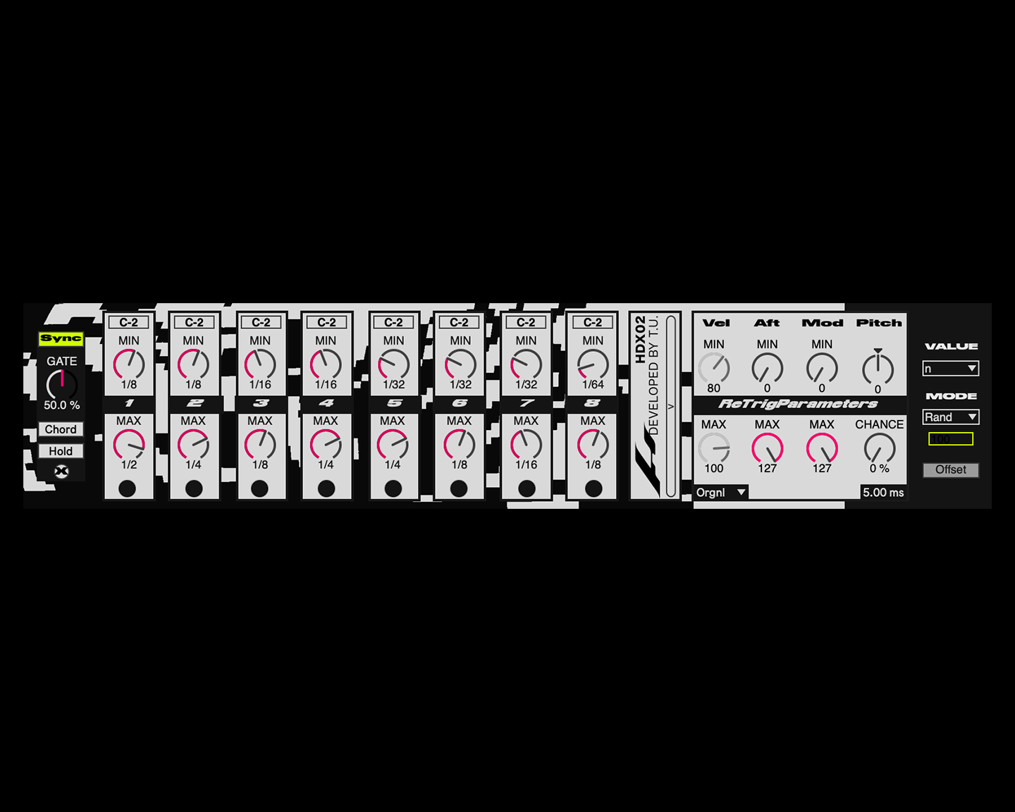 ReTrig is a MaxForLivedevice based on the concept of random voltage triggering found in eurorack modules, its purpose is to generate random and always changing patterns of notes. It behaves similarly to an arpeggiator but instead of repeating notes in a sequence the device holds and retriggers each incoming MIDI Note separately at a random speed, creating a more complex rhythmic pattern.