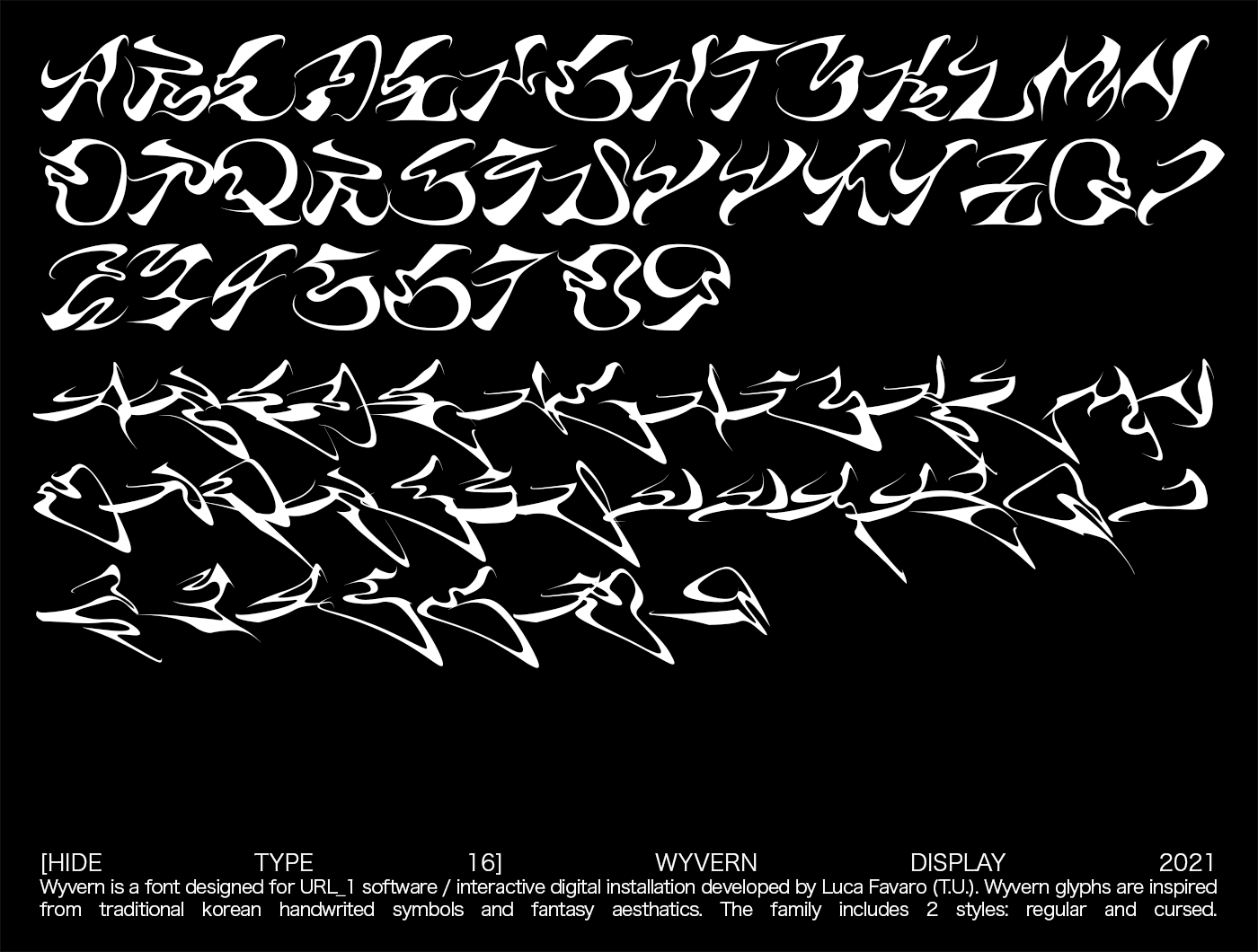 Wyvern is a font designed by Alex Ortiga (SY/IN) for URL_1 software / interactive digital installation developed by Luca Favaro (T.U.). Wyvern glyphs are inspired from traditional korean handwrited symbols and fantasy aesthatics. The family includes 2 styles: regular and cursed.
